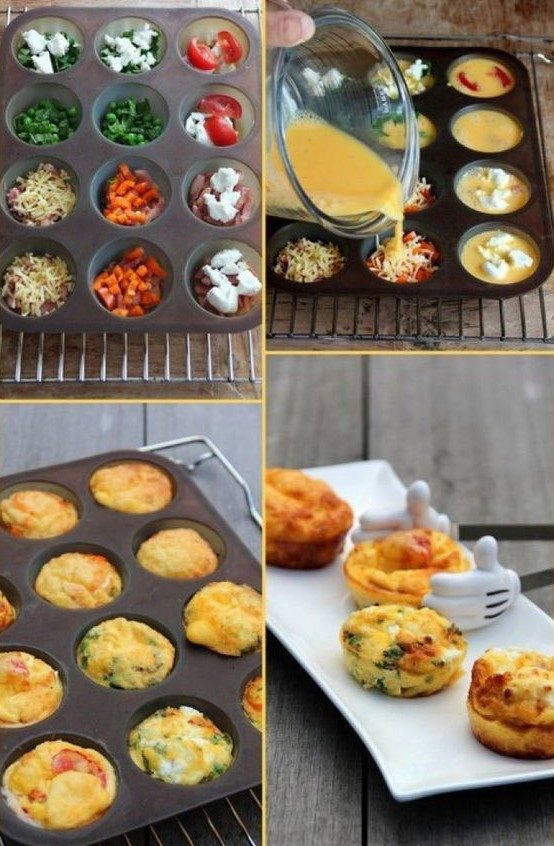 Очень удобная вещь для завтраков — форма для выпечки кексов. Омлет — яйцо, молоко и в него добавляйте все, что душе угодно — зелень, сыр, ветчину, овощи, замешали и выпекли