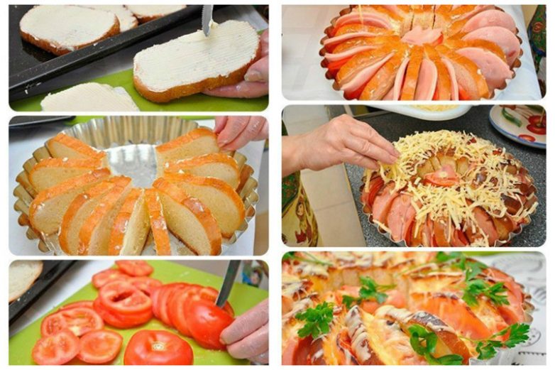 А кому надо сразу много бутербродов? Мажете маслом (или любым соусом), выкладываете по кругу, внутрь томаты, ветчину, заливаете омлет и посыпаете сыр, запекаете