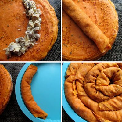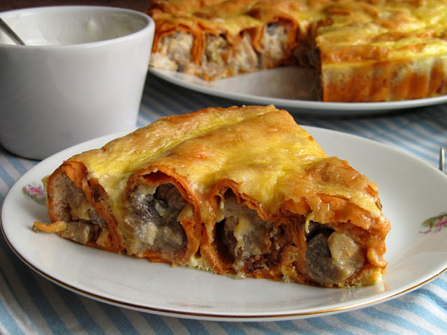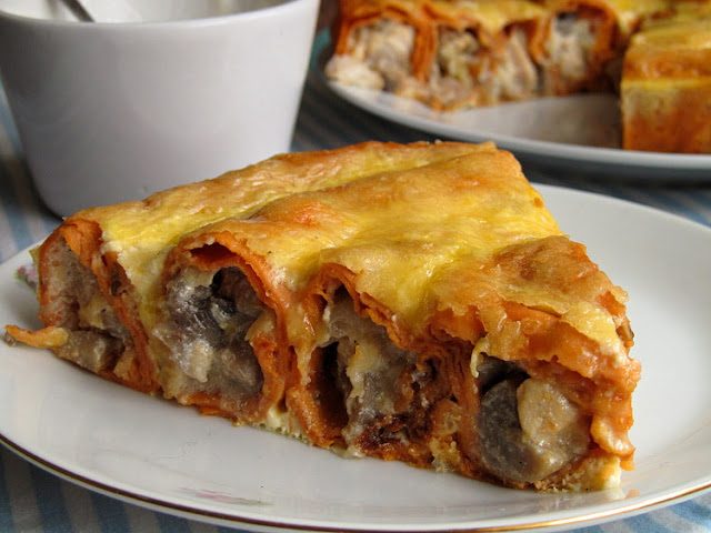 Вместо блинов использовал лаваш. Время решил сэкономить. вместо грудки вполне сошли сардельки с копченой колбасой и приправки всякие. 2 яйца для заливки этого количества начинки маловато. Использовал 4. Домашние хвалили. Спасибо за идею!