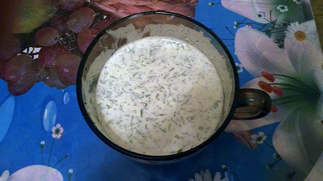 Добавляем в зелень сметану, всё перемешиваем и разбавляем кефиром до средней густоты: