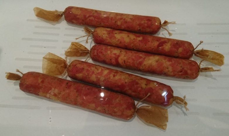 Батончики набиваю плотно. Видимые пузырьки воздуха, при необходимости удаляю, проколов тонкой иглой оболочку. Колбасу отправляю на ночь в холодильник.