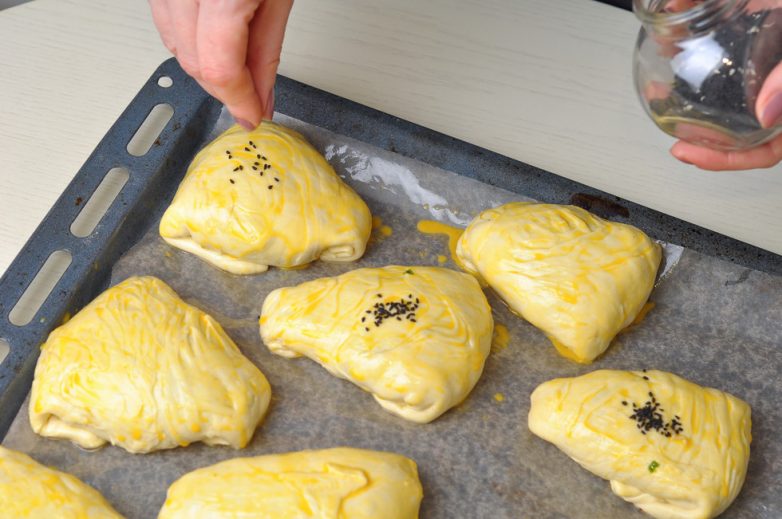 Самсу смазать желтком и присыпать сверху чёрным и белым кунжутом.