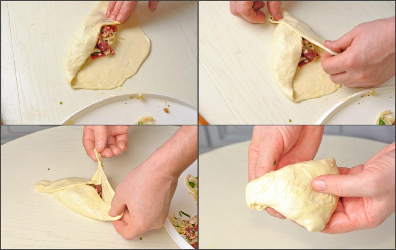 На середину раскатанного сочня положить начинку и с трёх сторон внахлёст накрыть её тестом, прижимая края теста. Сформированную самсу положить швом вниз на противень, смазанный растительным маслом.