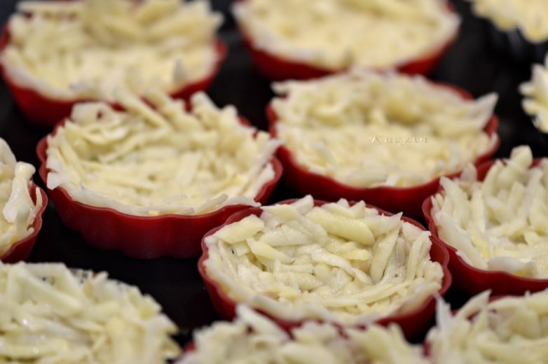 В смазанные растительным маслом силиконовые формочки (из железа вынимается хуже), выложить по 2 ст. л. тёртого картофеля, уплотнить, чтобы получились корзиночки толщиной в палец, примерно. Сверху смазать с помощью кисточки маслом.