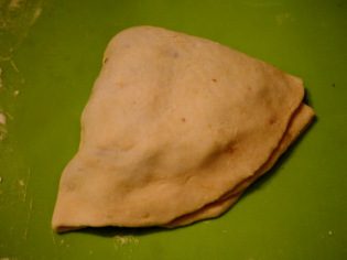 Из полученного треугольника руками сформовать круглую лепешку. Аккуратно, скалкой или руками расплющить равномерную круглую лепешку до размера сковороды.