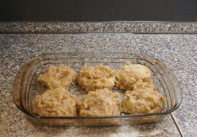 Формируем котлеты в емкости. Не нужно делать их очень большими. Из моего количества фарша получилось 6 котлет среднего размера.