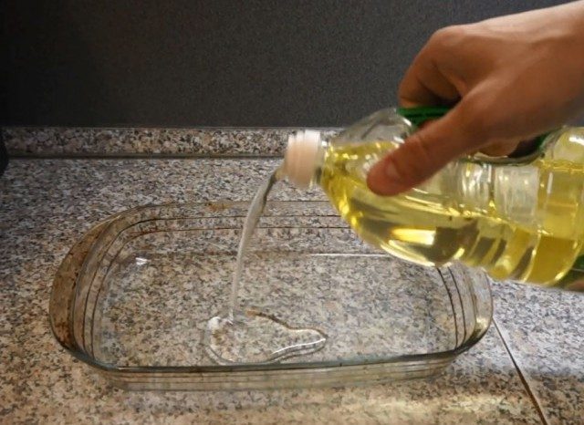 Наливаем масло в емкость, в которой мы будем запекать наши котлеты в духовке, чтобы они не прилипали.