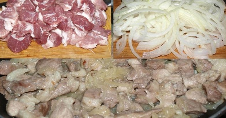 Нарежь мясо кусочками и обжарь на сковороде вместе с луковыми кольцами.
