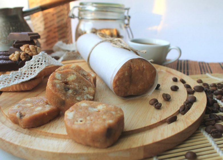 собираю все это в колбаску. На самом деле, форма может быть любая, можно сделать порционные пирожные, в виде конусов или шариков, можно положить массу в формочки для печенья, как вам нравится!