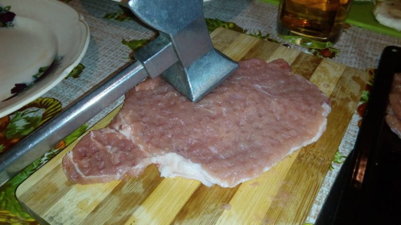Хорошенько отбиваем и срезаем жирок с мяса. На любителя — жировой слой можно оставить.