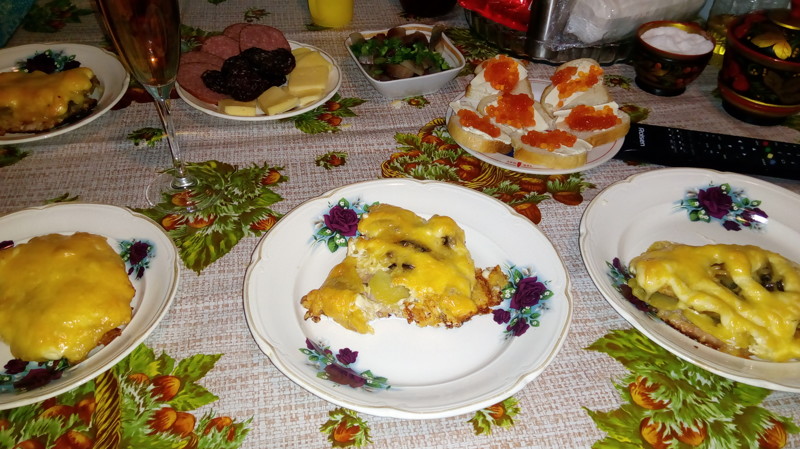 Затем все просто — выкладываю картофель и грибы на мясо. Сделал только половину, т.к. сын не ест ничего с грибами.