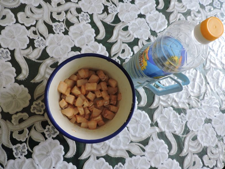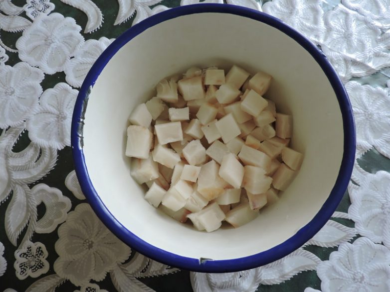 Ещё чуть замороженную рыбу порезать на небольшие кусочки