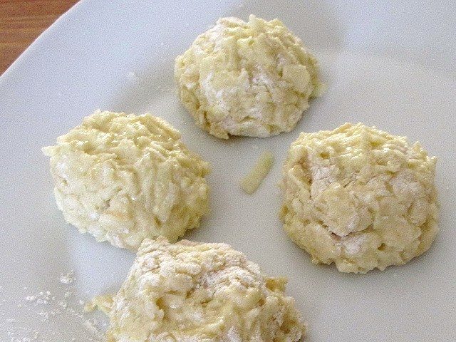 Яблочные шарики опускать в кипящую подсоленную воду небольшими партиями и варить минут 7-10 (через 5 минут достала 1 шарик, разломила — тесто внутри было еще сырое).