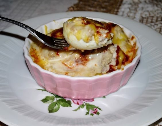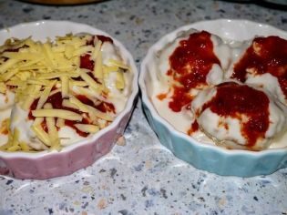 Всё хорошенько перемешать. Щедро наполнить яичные белки полученной начинкой и выложить их в емкость для запекания. Залиить всё остаткомсоуса бешамель. Сверху добавить томатный соус и посыпать натертым сыром. (чем больше сыра, тем сочнее).