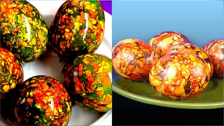 Опусти в раствор уже готовые яйца, проворачивай их, чтобы скорлупа покрывалась маслянистыми кольцами: чем больше маслянистых разводов, тем более «мраморным» будет окрас. Продержи яйца в краске положенное время — и готово!