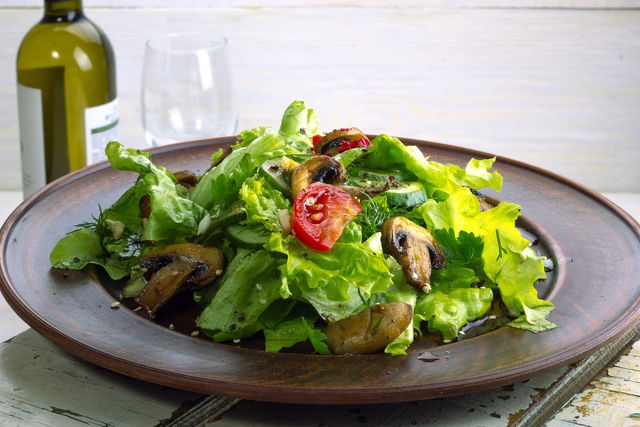 Листовой салат латук — незаменимый ингредиент весенних зеленых салатов. Нарезаем пластинками 300 г шампиньонов и поджариваем в масле. Рвем руками пучок латука, добавляем грибы, 5–7 помидорок черри четвертинками и ½ пучка зеленого лука, 1 огурец, нарезанный кружочками. Для заправки смешиваем 2 ч. л. оливкового масла, 2 ч. л. горчицы и щепотку соли. Поливаем ею наш салат и украшаем любимой зеленью по желанию: подойдет укроп, петрушка, кинза. Можно дополнить его кусочками жареного бекона на радость мясоедам.