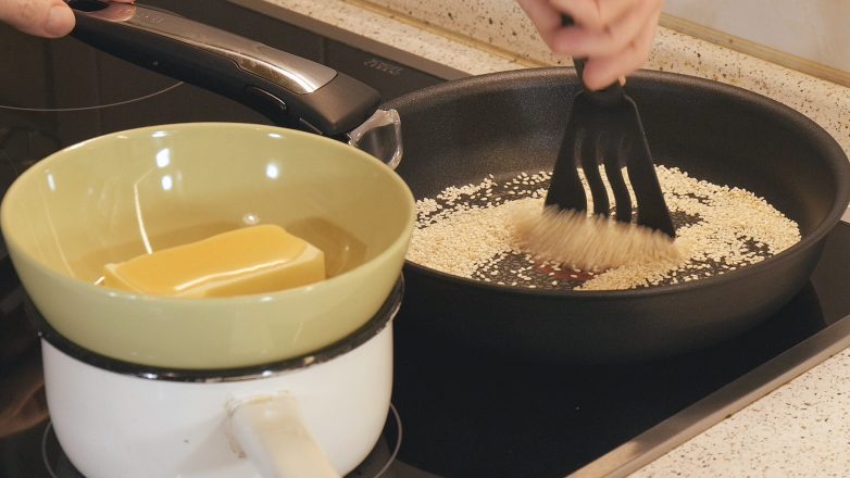 Пока масло с мёдом растапливаются, на сухой сковороде обжариваем 50 грамм кунжута до слегка золотистого цвета, постоянно помешивая. Когда масло с мёдом растопились, а кунжут обжарился, и то, и другое надо охладить до комнатной температуры.