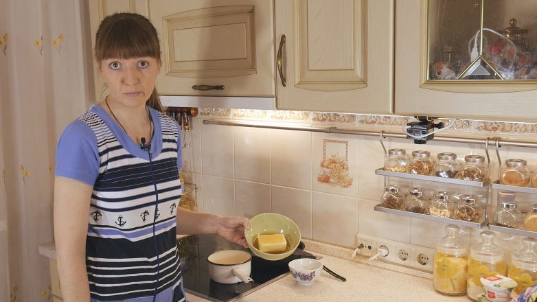 Берём 200-граммовую пачку маргарина для выпечки или сливочного масла и разминаем её рукой.