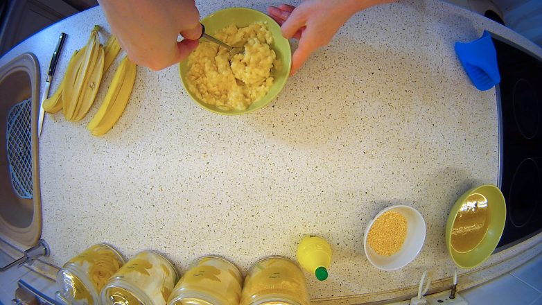 Добавляем в смесь банановое пюре. Перемешиваем.