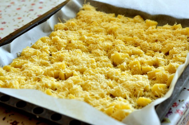 Золотистые, ароматные кубики картофеля, с тонкой, румяной корочкой из запеченого сыра.