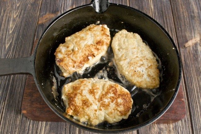 В сковороду наливаем 2-3 столовые ложки растительного масла для жарки. Как только масло разогреется, кладём котлеты, жарим на сильном огне до румяной корочки с двух сторон примерно 2 минуты с каждой стороны. Затем складываем в жаровню, закрываем крышкой и томим на маленьком огне 10 минут. Можно томить рыбные котлеты в сметанном или томатном соусе – получится блюдо с готовой подливой.