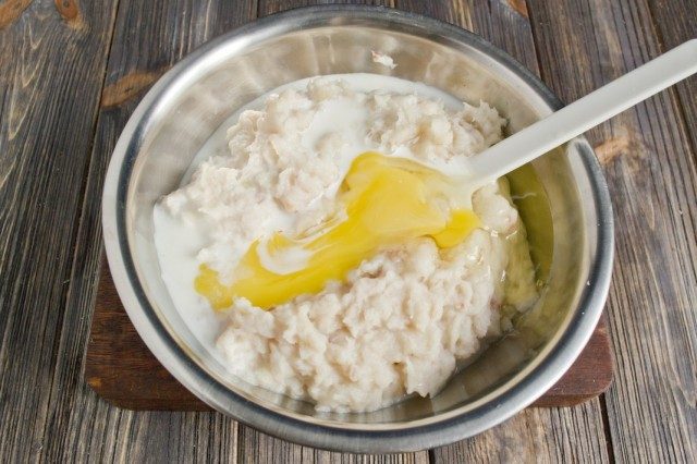 Добавляем в миску два сырых куриных яйца, предварительно смешав желтки с белками.