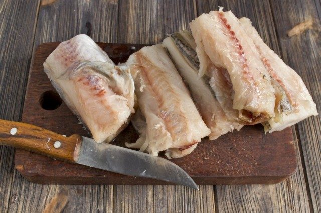 Свежемороженый минтай кладём на нижнюю полку холодильника за 4-5 часов до приготовления. Затем моем, счищаем чешую, удаляем внутренности, отрезаем примерно 1\3 тушки со стороны хвоста. С кусков минтая снимаем кожу, срезаем филе с костей остро заточенным ножом.