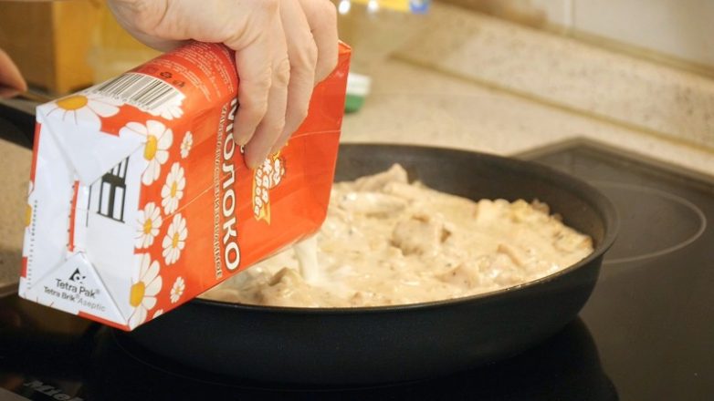 Пока курица обжаривается, нарезаем репчатый лук произвольно. Количество зависит от того, насколько вы любите лук. Сильно любите — режьте много. Не любите — исключите этот пункт вовсе :)Теперь смешиваем соус. Наливаем молоко в миску (его примерное количество можно увидеть на фото, а ещё точнее на видео, т.к. я его в процессе ещё добавляла). Чем больше молока, тем больше получится соуса.