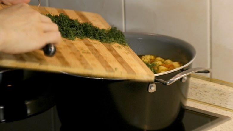 А в это время нарезаем укроп или любую другую вашу любимую зелень. В этот суп можно класть всё, что вашей душе угодно — главное сделать сырные шарики, чтобы не потерялась идея :)