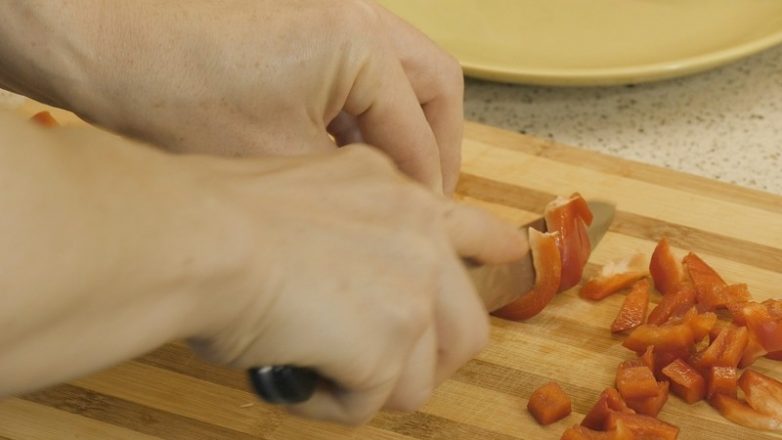 … и болгарский перец режем мелкими кубиками.Отправляем овощи обжариваться на растительном масле.