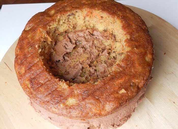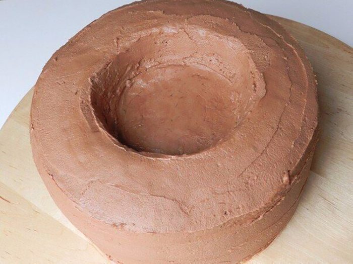 Теперь приступаем к подаче. Готовый кулич разрежь на три части и тщательно промажь его шоколадным кремом.