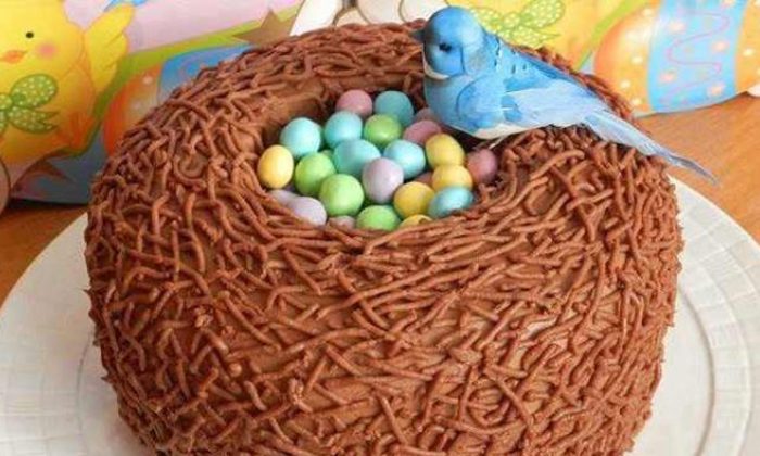 В гнездо выложи разноцветные сладости. Украшением могут служить и конфеты «морские камешки» и «m&m’s». Для придания реалистичности можно использовать декоративную птичку или пасхальных яйца из мастики, которые продаются перед праздниками в любом кондитерском магазине.