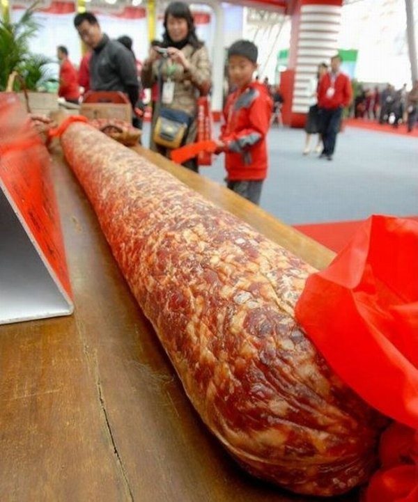 Самую большую колбасу — у нас она называется «Любительская»- я с коллегами ел в Италии, в командировке. После работы решили «посидеть за рюмкой чая», все с тоской вспомнили нашу «Любительскую», т.к. салями 100 сортов уже осточертела.Мне как раз выпало покупать колбасу. И -!!! В гастрономе нашёл-таки нашу «Любительскую» — палка длиной 2,5 — 3 метра и диаметром с колесо мотоцикла.Попробую вставить фото — не получится — извините!