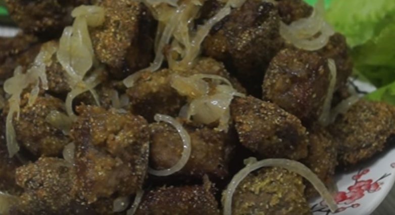 Лук обжарить на сковороде, в этом масле обжариваем промаринованные кусочки печени обваленные в кукурузной муке.
