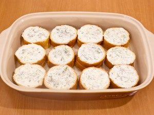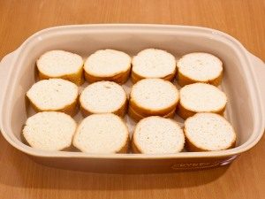 Батон нарезать кусочками толщиной 2 см.