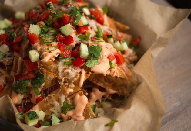 Полейте готовые чипсы соусом и выложите сверху нарезанные овощи. Дополните блюдо свежей зеленью и тут же подавайте, желательно в сопровождении бокала пива.