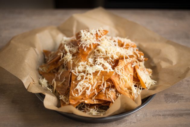 Отправьте чипсы в разогретую до 190 градусов духовку на 3–4 минуты, чтобы сыр расплавился.