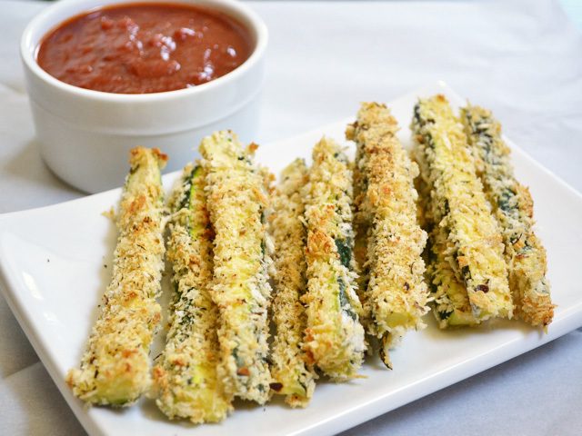 6. Полоски кабачки одну за другой окунуть в яйцо, а затем обвалять в смеси из панировки и сыра.