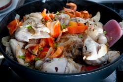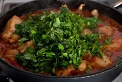 Убавьте огонь, верните курицу в сковороду к луку, добавьте порезанный кубиками болгарский перец и мелко порезанный острый перчик (или его часть), кориандр, уцхо-сунели и тушите на медленном огне 15-20 минут.