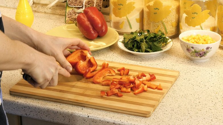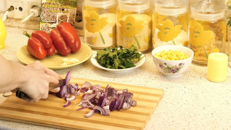 Ожидающим точных пропорций предлагаем дальше не читать — тут, как всегда, всё на глаз :) Берём красный лук и режем его произвольно, например, четвертькольцами.