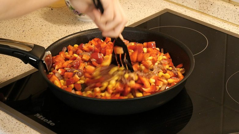 Когда лук немного обжарился, добавляем к нему кукурузу и некоторое время (недолго) обжариваем всё вместе.
