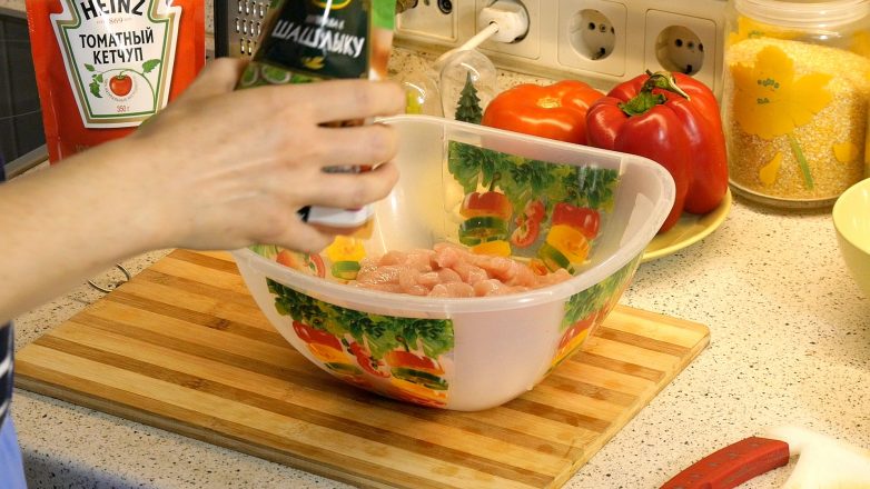 Пропорций в рецепте нет — всё на глаз. У меня были филе курицы и свинины. Я смешала их в одной миске…