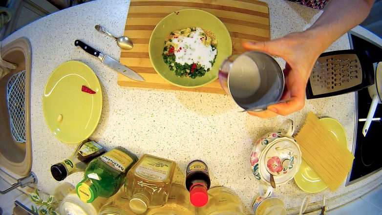 Когда сливочное масло растопилось, выкладываем в сковороду соус, который мы смешивали в миске, и немного прогреваем. После этого выкладываем в сковороду отваренные спагетти, перемешиваем…