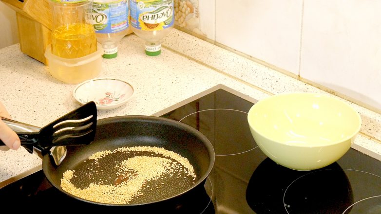 Поскольку это кулинарное творение, а не инженерный проект, в количестве смешиваемых ингредиентов опираемся на вкус, интуицию и размах предстоящего банкета :) Итак: произвольное количества кунжута обжариваем на сухой сковороде до приятного потемнения (до неприятного не доводим).