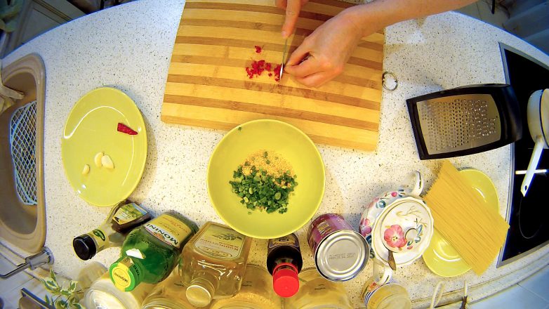 В подсоленной воде отвариваем нужное вам количество спагетти, не забывая, что в составе будущего соуса есть очень солёный соевый соус. А в сковороде в это время растапливаем небольшой кусочек сливочного масла, помня о том, что в составе соуса у нас уже присутствуют два вида масла.