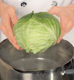 Капусту сполоснуть, удалив верхние листья. В большой кастрюле вскипятить подсоленную воду. Опустить кочан на 4 мин. Выложить на решетку донцем вверх и дать обсохнуть.