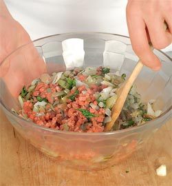 Смешать в миске мясной фарш с обжаренными луком, чесноком и зеленью. Добавить 0,5 стакана хлебных крошек, 1 яйцо, соль и перец. Тщательно вымесить, накрыть и поставить в холодильник