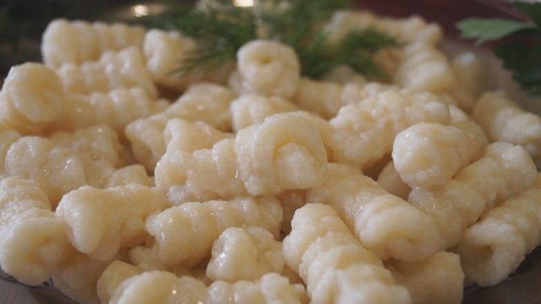 Нарезаем на кусочки. Можно их уже сразу варить, а можно придать им красивую форму, Берем кусочек теста обмакиваем нижнюю часть в муке и кладем его на вилку, пальцем приминаем кусочек теста к вилке, теперь сворачиваем рулетик к краю вилке. Краем вилки прижимаем край. Вареник готов.
