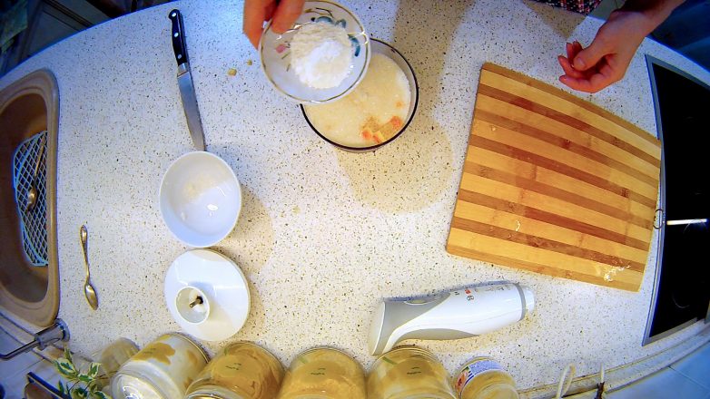 Добавляем полчайной ложки соды и щепотку соли. Перемешиваем.