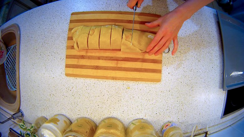Достаём рулет из холодильника и нарезаем ломтиками толщиной по 3 сантиметра.